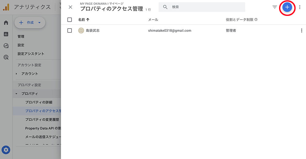 3、「プロパティのアクセス管理」の右上の+ボタンをクリック
