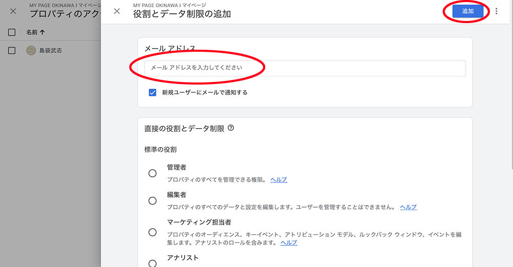 5、「メールアドレス」の欄に権限を追加したい方のGメールアドレスを入力して「直接の役割とデータ権限」の欄にて、共有したい権限のいずれかを選んでチェック。